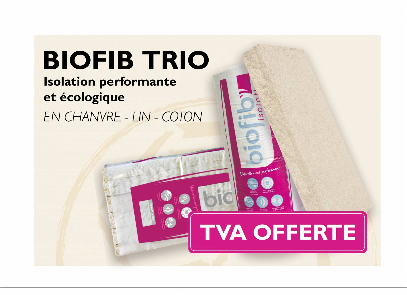 Chez Arboga, nous croyons fermement en la synergie entre l'écologie et l'économie. C'est pourquoi, durant les mois de mai et juin 2024, nous vous offrons une occasion unique de bénéficier de nos bonnes affaires, avec la TVA offerte sur une sélection exclusive de notre isolant écologique, le Biofib Trio.